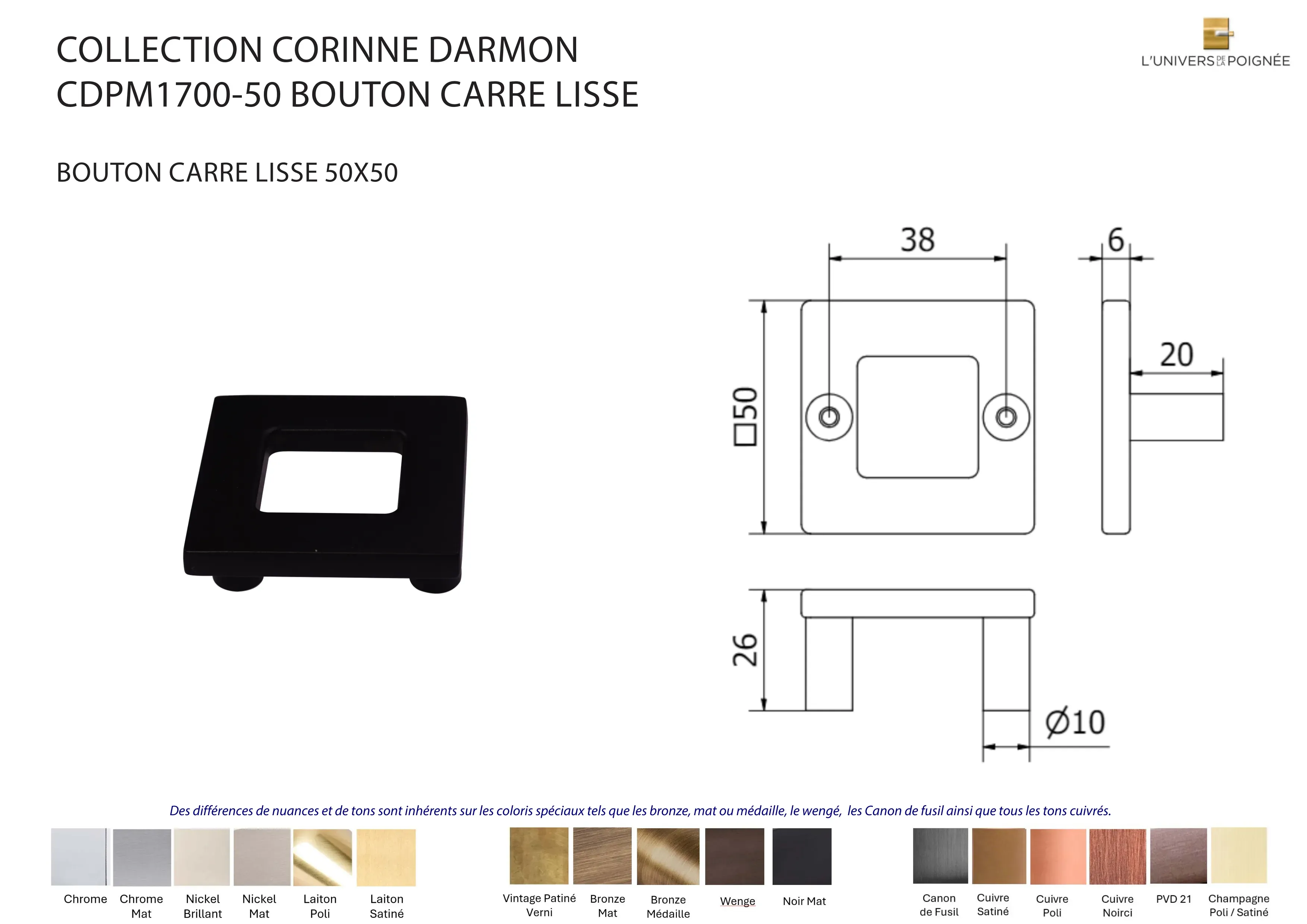 Des différences de nuances et de tons sont inhérents sur les coloris spéciaux tels que les bronze, mat ou médaille, le Wengé, les Canon de fusil ainsi que tous les tons cuivrés.