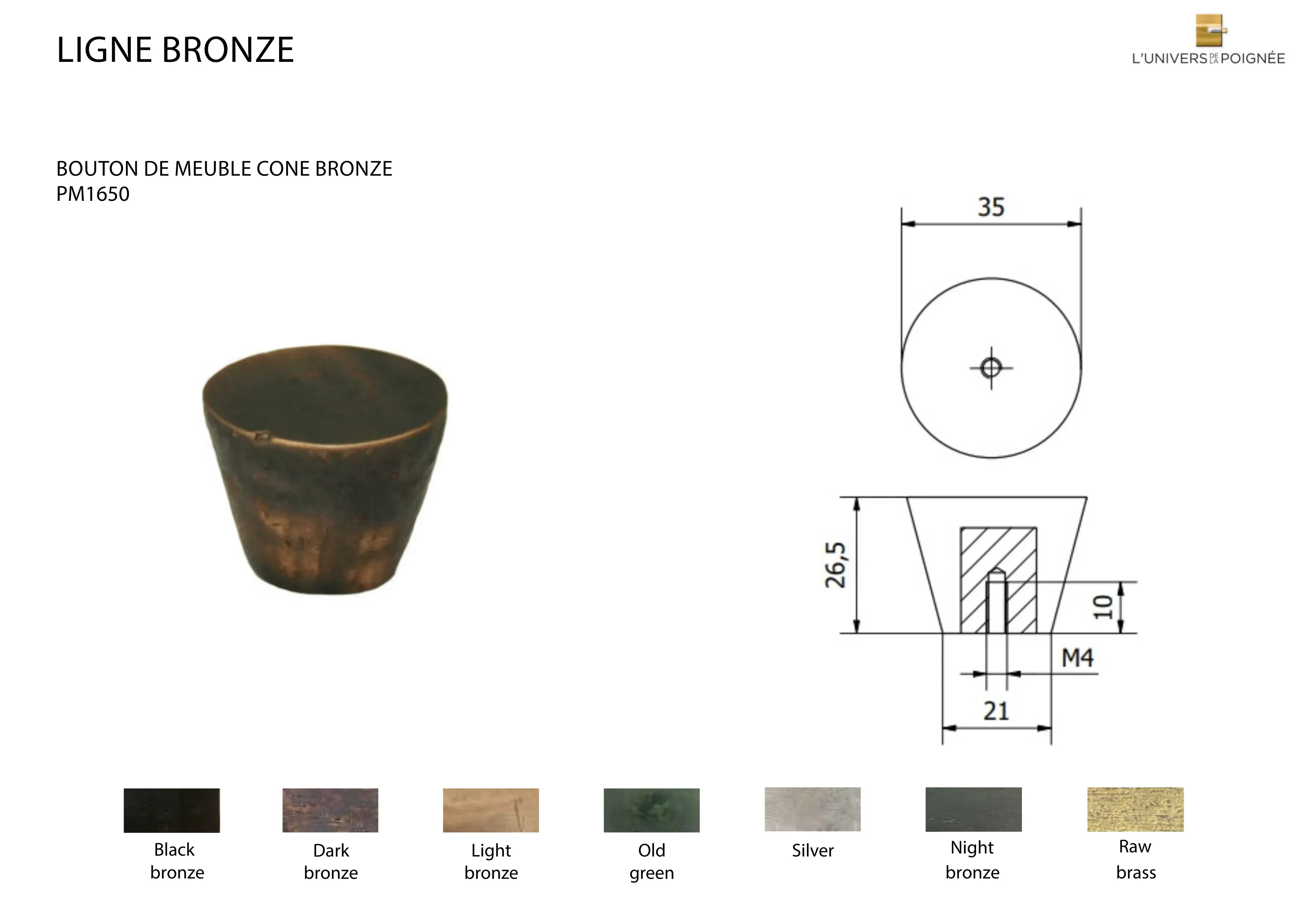 Les finitions disponibles incluent : Black bronze ; Dark Bronze ; Light Bronze ; Old Green ; Silver ; Night Bronze ; Old Brass ; Nickel Brillant