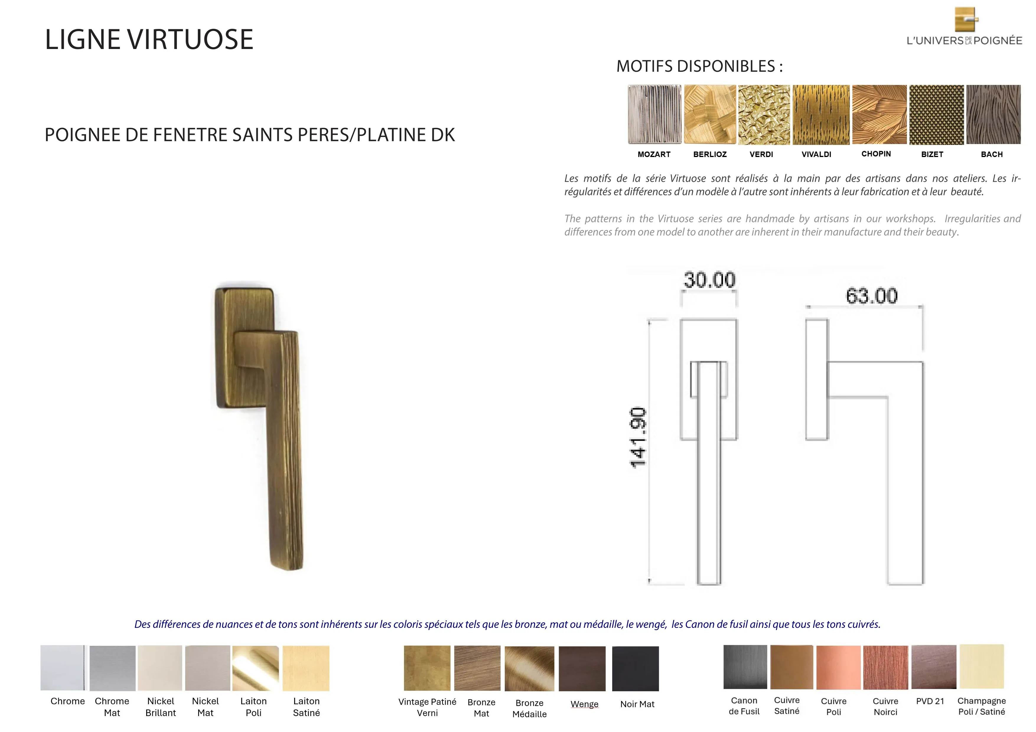 Parce que chaque intérieur mérite une finition sur mesure, la poignée de fenêtre Chemin de Fer est disponible en plus de 15 coloris différents, parmi lesquels : Laiton satiné ; Laiton poli ; Chrome mat ; Chrome brillant ; Nickel mat ; Nickel brillant ; Bronze mat ; Bronze médaille ; Bronze vintage ; Wengé ; Blanc ; Noir mat ; Canon de fusil ; Cuivre satiné ; Cuivre brillant ; Cuivre noirci ; Champagne mat ; Champagne brillant