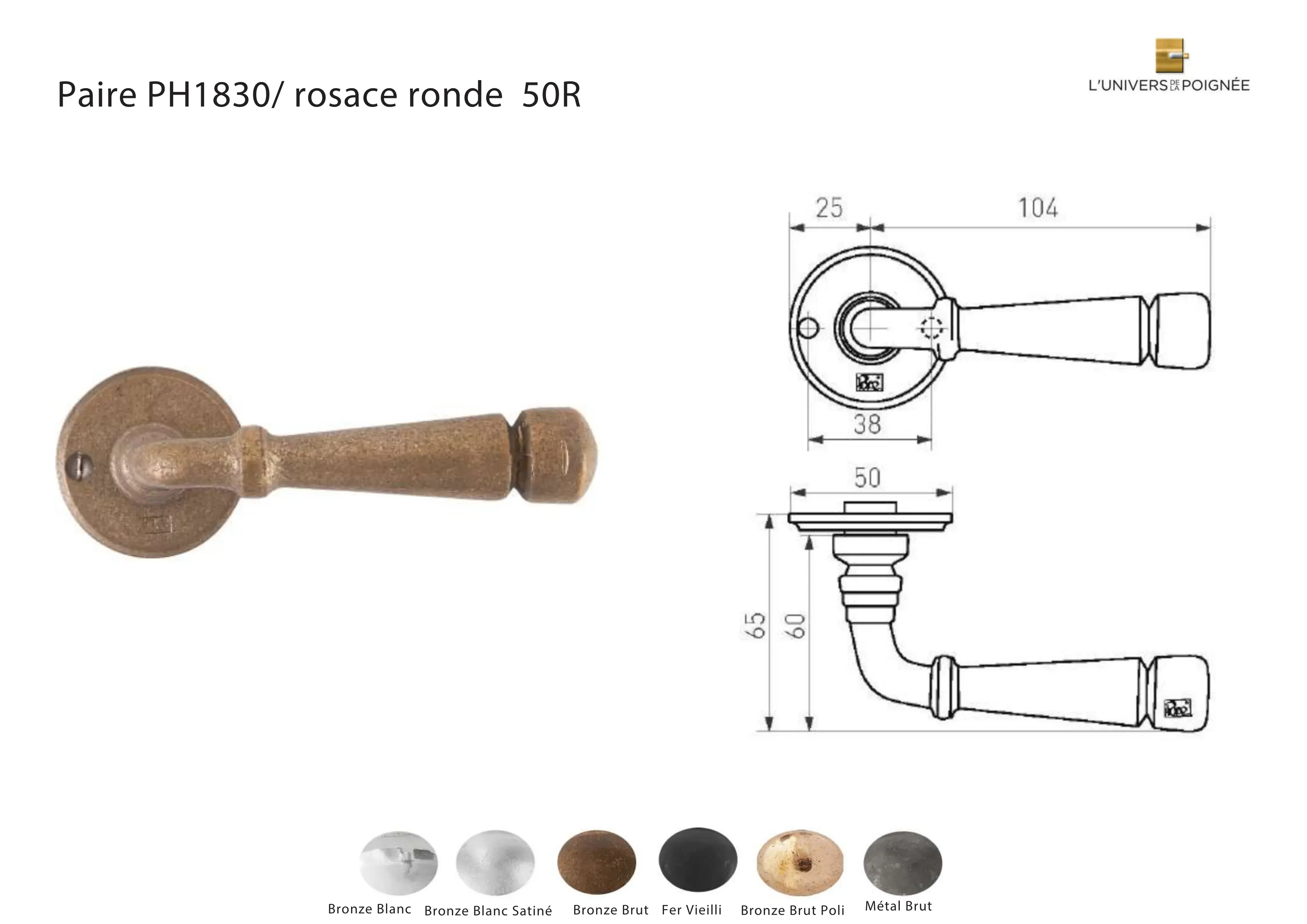Disponible en 6 finitions possibles, cette collection s’adapte à divers styles et ambiances, offrant une touche de raffinement et de modernité à chaque pièce : Fer vieilli ; Métal brut ; Bronze blanc ; Bronze blanc satiné ; Bronze brut ; Bronze brut poli